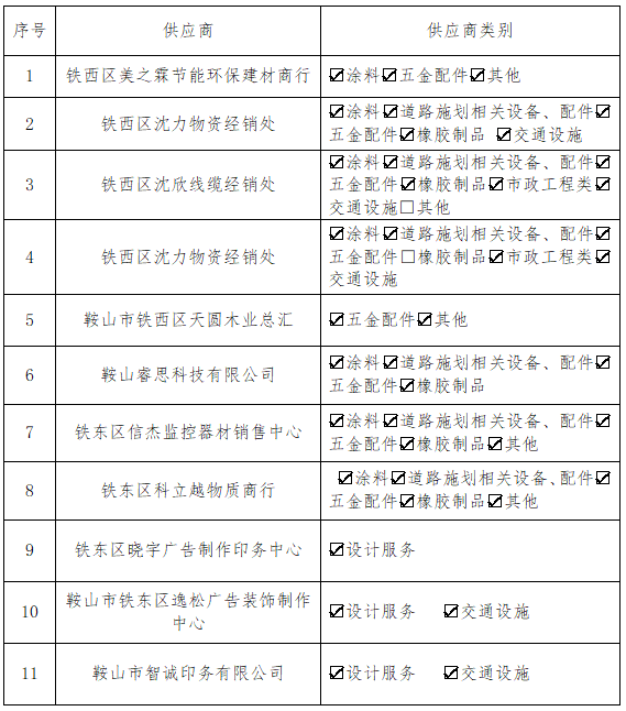 根據(jù)2024年5月11日發(fā)布的《供應(yīng)商入庫公告》要求,經(jīng)過報名篩選和資質(zhì)審查等程序,確定了11家供應(yīng)商符合入庫條件。現(xiàn)公布經(jīng)過篩選的供應(yīng)商入庫清單,名單如下: